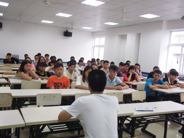 图为:化工学院陈凯华老师正在为岳阳班新生开第一次班会
