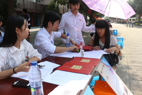 团学社招新工作于9月27-29日在学校文化街和思源广场开展。各部门分工合作,积极筹备,而且干事们都身着整齐的服装,力争展现各部门的风采。虽然天气炎热,但大家对工作的热情却丝毫不减,各部门干事依旧热情地给新生讲解各部门的特色及职能以便帮助新生更好地了解自己的部门,让更多的新生加入到团学社中来。通过大家的努力,前来报名的新生络绎不绝,气氛热烈异常。