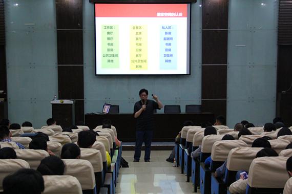 为了让建筑装饰工程技术专业学生对室内设计有更深的了解和认识,建工学院建筑装饰专业于十月九日下午14:00在明德楼的105会议室开了专业介绍讲座,本次讲座邀请了Ted Su为主讲,参加本次讲座的人员有建工学院建筑装饰专业主任杨赪老师、十杰装饰等公司的设计师们、以及建筑装饰工程技术专业的大一、大二全体学生。首先,苏老师用同一个模特的不同图片向大家诠释了什么是软装,什么是硬装。简单的几句话就将软装硬装诠释得淋漓尽致,同时也给大家引进了整体软装。这是苏老师从美国学到的,是国内许多设计师都还没有完全了解的一个概念。接下来讲到的是居家空间,他点出了三个大家最容易忽视的地方,玄关、厨房、卫生间。还有起居室的位置问题也是特别重要的,要合理也要方便。其次就是室内外融合,他用几张设计成品图总结到要注重室内外的整体感觉,两者之间的分界线不必过分清楚。最后,就是动线分析。融合着设计师的提问,苏老师说只有通过对整体空间结构合理的分析,才能更好的摆放好家具的位置。期间,面对设计师或学生都有提出对于该专业或专业外的问题,他不仅将自己丰富的设计经验分享给大家,也提到了面对不理解设计的客户该如何解说。他说,不是每个项目都赚钱,不是每个客户都合作。