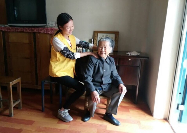 图为:化工学院志愿者正在给老人捶背