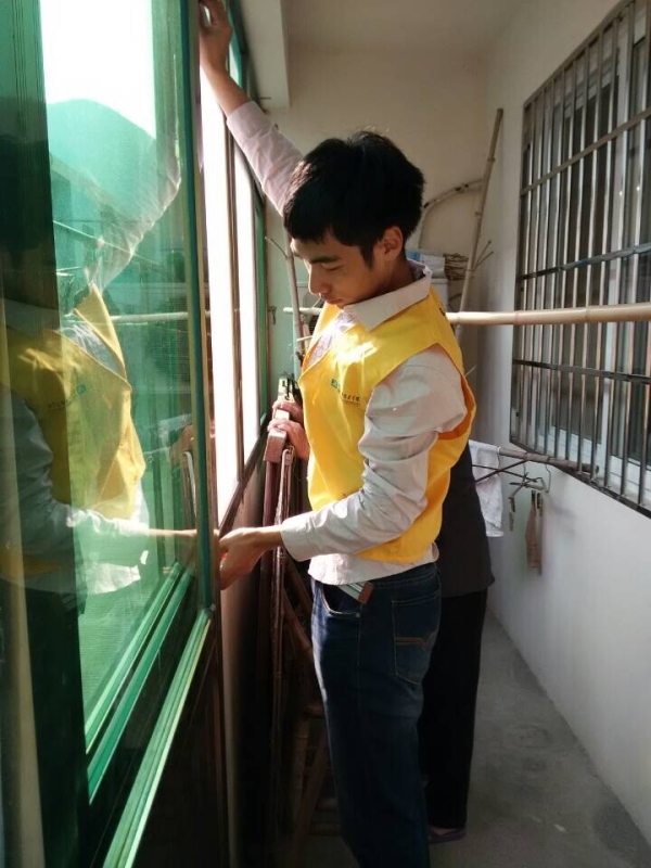 图为:化工学院志愿者部负责人阮海峰正在修窗户