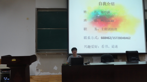 电信学院学生会起着上传下达,沟通左右,联系内外的枢纽作用。主席团助理的郑玲珑同学用幽默风趣的主持风格,结合PPT内容,将此次培训大会分为“学生会组成、学生会活动、干事法则”三个方面进行讲演。
