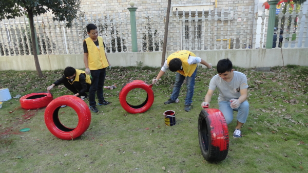下午1点,幼儿园老师在详细介绍工作之后,志愿者们马上投入到工作之中。开始搬运轮胎和给轮胎上色,涂漆。由于工作期间,幼儿园的孩子们正在午睡,我院志愿者的活动便在一片静悄悄地进行。
