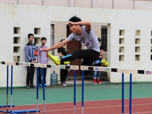 随着裁判员一声令下,所有运动员如离弦的箭一般冲了出去。运动员们来势汹汹,个个目光坚毅,丝毫不把眼前的栏当成难以逾越的鸿沟,他们马力十足,一个高抬腿、跳跃,便跨过了这些阻拦他们前进的栏,一个又一个,马不停蹄地奔向终点。这些栏就好比人在追梦旅程中遇到的困难,每多跨过一个,就向自己的理想更近了一步。在预赛就表现良好的模具3134娄洋果然不负众望,跑了17.3秒的好成绩,荣获决赛第一名。化工3132的赵冬冬同学令人印象很深刻。他从来没有接受过跨栏训练,但是为了集体荣誉感上场了。在跨最后几个栏时不幸摔倒了,但是他没有中途放弃,而是坚持要跨完最后一个,不过由于膝盖腿部多处受伤无法跨越最后一个栏。