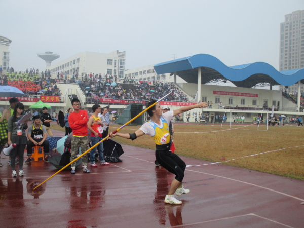 伴随着啦啦队的加油声,参加4*400的运动健儿们面对强劲的对手毫不畏惧,在赛场上拼尽全力,创造属于他们的荣誉。女子组由会计专业获第四名,而男子营销旅游专业以4分07秒5的成绩夺得亚军。紧接着是扣人心弦的标枪项目,我分院营销旅游专业的宋子富以53.80米的优异成绩一举夺下冠军宝座,此外更值得一提的是,宋子富同学破了市大学生记录。