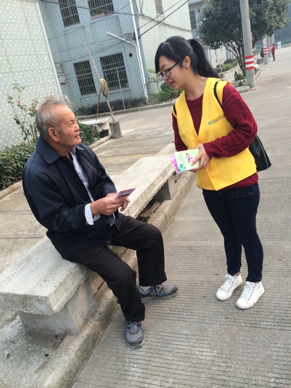 其中一名志愿者来到一户老人家门前,轻轻的叩门,过了一会儿,门慢慢的开了,一位年迈的老爷爷探出身来疑惑看着我们,我们连忙上前说:“爷爷这个给你看的”看到我们的服装和手中的宣传册,走了出来,笑眯眯的接过宣传单,亲切的说, “谢谢你们。”志愿者连忙摆手说:“不客气,爷爷,这是我们该做的。”爷爷开心的点点头,微笑的看着我们说:“志愿者好,志愿者好呀!”微笑的看着我们离开。然后我们一家一家敲门下了,出来的差不多都是一些孤寡老人,几位老奶奶坐在门口台阶上好奇的看着我们,便走了过去,我们说明了我们的来意之后,她们很热情的接过我们手上的宣传单,她们每一位亲切的微笑让我们这些已感到疲惫志愿者充满了动力。