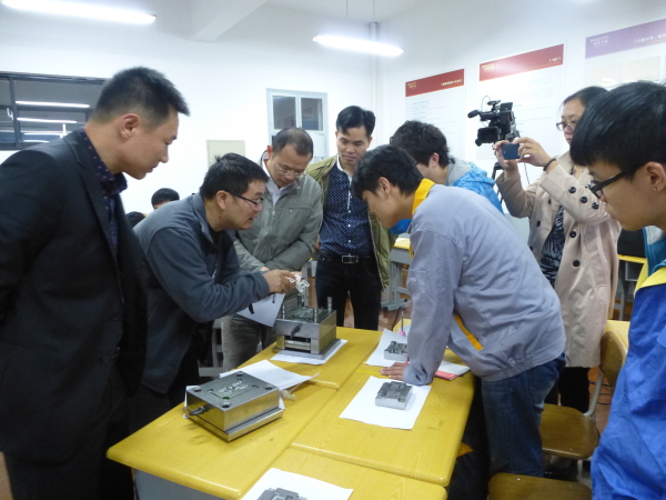 2014年11月7日上午,在阳明学院教室一举行模具3131班的课程考核,对学生7周内制作完成的模具及试制出来的产品进行评审。参加此次评审会的有宁波职业技术学院教务处处长周亚,余姚鼎捷塑模有限公司副总经理别志伟,宁波职业技术学院海天学院副院长王正才,模具设计与制造专业主任柯春松及校企相关指导教师。