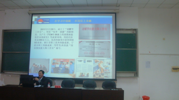 为使电信学院的学生更加了解所学的专业理论,2014年11月10日,电信学院在精技楼503开展了劳模胡耀华的讲座,此次讲座特邀宁波港股份有限公司劳模胡耀华,由电信学院吴志荣院长主持此次讲座,电信学院物联网、电子专业的全体学生参加了本次讲座。