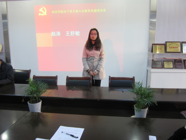 大会第一部分,六名新党员的通表。戴佳乐、刘丽红、金晓彬、盛培桢、施凯宇、朱佳奇六人,分别对党支部进行了认真详细的自我介绍、工作思想情况、对党的认识以及入党的动机,表明自己志愿加入中国共产党。之后入党联系人向党支部宣读联系意见并对六位同学发表了中肯的意见以及建议。表示各支部党员一致同意该六名同学加入党组织,成为预备党员。