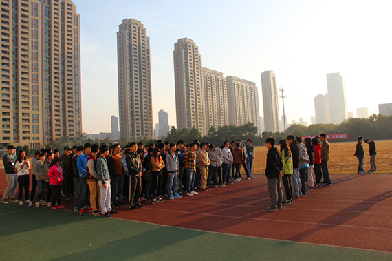 为了增进建工学院学生会各部门之间的友谊,促进今后活动的开展,增强体质,12号早上6点30分,建工学院全体学生会成员在东校区操场上进行第一次晨练。在规定的晨练时间内,若有些成员未能按时到达,根据晨练中的规定会对这些迟到的成员进行惩罚,一人迟到全部门一起受罚。受罚中需要部门间的成员达成默契,肩搭肩,同步做深蹲起。这个惩罚是在告诫大家:这是一个团体,无论发生什么,都要有福同享,有难同当。晨练活动中,学生会十大部门共被分为五组:体育部和素质拓展部一组,生活监察部和学习部一组,新闻中心部和办公室一组,组织部和志愿者部一组,文娱部和宣传部一组。