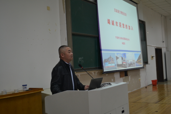 宣讲会的开始,由邱璐轶老师大致介绍了宁波市口岸协会的发展状况。接下来是林建华董事的讲话,与同学们讨论了人活着的四十年间做的事情和白领品牌的一天,就现今学生时刻离不开手机的现象展开,幽默诙谐的语言引得现场掌声阵阵,气氛更是热烈。 他还讲到,“成熟的人就是有远见有眼光,会想到以后,而不只是局限于现在。”之后他提到宁波港的发展,优越的地理位置和人文历史,同时感慨到他将青春献给了宁波港,而宁波港同样回馈他很多东西。谈及协会,林建华向同学介绍了协会的岗位需求,并一一做出解释。宣讲会的最后,他更是讲到参加招聘的三大法宝,一要面带微笑,二是讲话大声,三则确定自己的行业且坚持下去。
