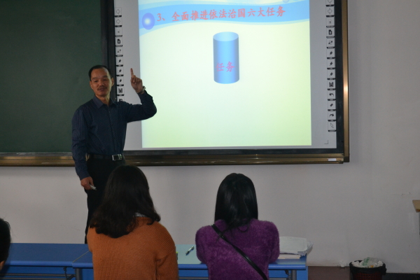 首先,马老师以五个问题展开话题,让同学们了解了十八届四中全会的大致情况,并在接下来时间里用数据分析了当今中国在国际日渐强大,并以其独特的视角,对刚审核通过的《中共中央关于全面推进依法治国若干重大问题的决定》的内容及其精神做出了详细的介绍,同时将十八届四中全会精神的深刻理解贯穿始终。并对中国社会问题进行了详细的分析,在场的同学也都认真聆听,做好笔记,不时的与老师互动。在讲座最后,马老师希望我们能够多学习政治知识,并能在未来的学习生活中认真实践。