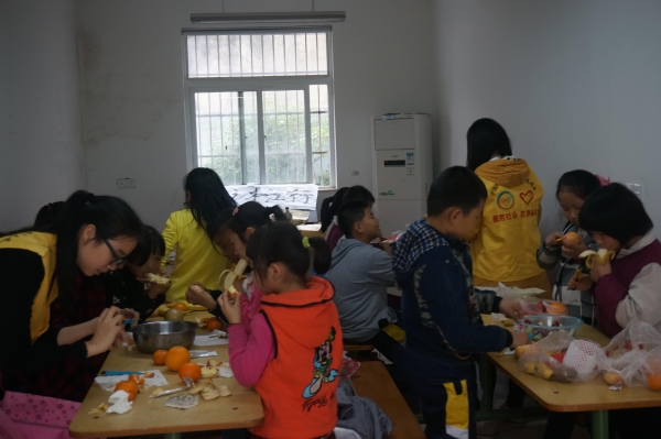 在这些孩子的身上志愿者们看到了无限的想象力与创造力,他们用自己的小手实现着自己的梦想。在接下来的手工活动中,这些可爱的小天使们在志愿者的帮助下用各式各样的水果设计自己的水果拼盘。不得不说,有些小朋友的动手能力一点也不输给志愿者们。与此同时,个别没带水果的小朋友也在其他小朋友的分享下一同参与到了其中,课堂气氛十分融洽。