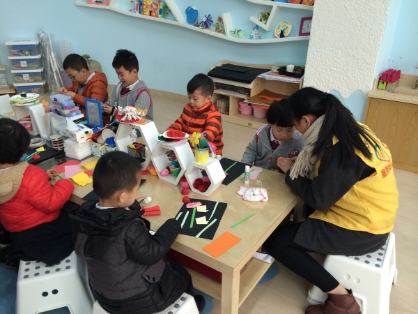 尽管风吹的很猛烈,但这丝毫没有影响到志愿者们的服务热情。到达目的地后,志愿者服务大队干事分配好人员,所有志愿者们马上进入了各自工作的区域。本次志愿者活动主要是在科技馆、生活馆、生命馆、美术馆内协助老师交给小朋友们一些知识与技能。志愿者们很快就进入了状态,科技馆的志愿者们认真地教小朋友们做实验,而生命馆的志愿者们带着小朋友耐心地听老师介绍不同的生物,在传递爱心的同时也丰富了自我。生活馆是最热闹的,小朋友们在志愿者的帮助下学会了做饼干,整个房间不仅充满了饼干的香味,还洋溢着幸福感。美术馆内的小朋友们坐在志愿者的旁边认真地学剪小红花,时不时地发出快乐的笑声。