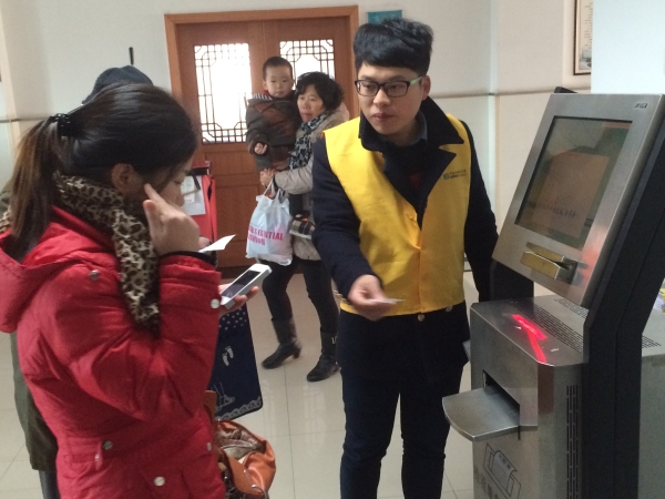 寒意渐浓的冬日,志愿者们到达目的地。先虚心的请教一些问题,熟悉与注意相关事宜。在护士的安排下,分为5组。志愿者们很快投入到了引导患者就诊的繁忙工作中。有的在检验单自助取单机处为着急的病人取化验单,细心地向病人讲解有关问题。有的在咨询处帮忙叫号,遇到有些病人对于先后顺序有歧义时,也耐心地一一解答,有效的再安排好。当有不知去向的病人时,也会帮他们指路。面对形形色色的患者,7名志愿者都在耐心地解疑答惑,为患者提供服务,一句谢谢就是对于他们最好的回报。面带微笑,身穿黄色马甲的志愿者们成为医院里一道独特的风景线。