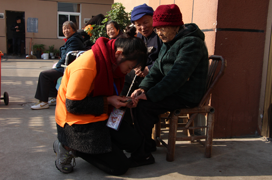图为:义工大队的同学给老人剪指甲