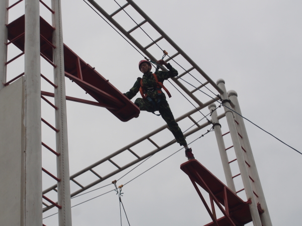 上午的主要的挑战项目为“信任背摔”和“高空跳跃”。“信任背摔”要求每个队员都要笔直的从1.6米的平台上向后倒下,而其他队员则伸出双手保护他。要获得他人的信任,就要先做个值得他人信任的人。这个项目能让使队员在活动中建立及加强对伙伴的信任感及责任感。“高空跳跃”是个挑战自我项目,学生站在几十米的高空中,要求在不抓绳索的前提下,跳跃一米的距离,跃到另一侧。过程里不时爆发出阵阵的惊呼声,吼叫打气……一切的一切都在最后化为一阵阵成功的喜悦欢呼声,看着大家一个个相聚环抱,那种欢快的情绪足以感染在场的所有人。