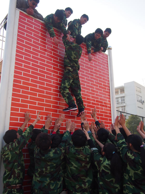 下午的挑战是“翻越毕业墙”。看着一堵近5米的高墙,所有人都是静静的伫立了几秒中,相信所有人的心中都在怀疑、猜测。不可否认,今天所经历的一切都是那么新鲜、刺激,充满着挑战,但并非是不可征服的。最后,每一个班级都在夕阳的余辉中聚集,拍了纪念的合照。