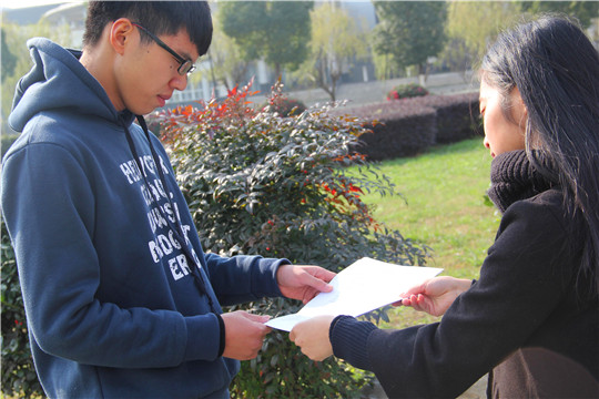 图为:志愿者在向同学发放调查表