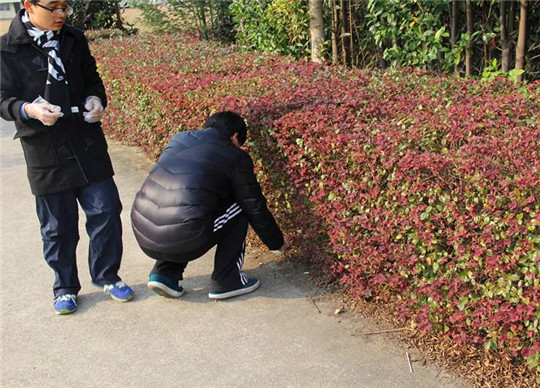 图为:志愿者在校园一角捡烟头