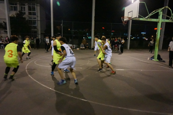 晚上19时50分,经过短暂的热身运动,比赛正式开始,开场的哨音刚落,电信学院队员便主动出击,以矫健熟练的动作迅速传球,直逼篮板。尽管艺术学院的队员也不甘示弱,抵死防守,但终究以2分之差在第一节落后电信学院。第二节开始,由于经过第一节的适应,艺术学院队员经过调整战术,全力打好配合,快攻猛打,充分利用自身身体的优势,多次抢到篮板球。上半场比赛结束,比分基本持平。