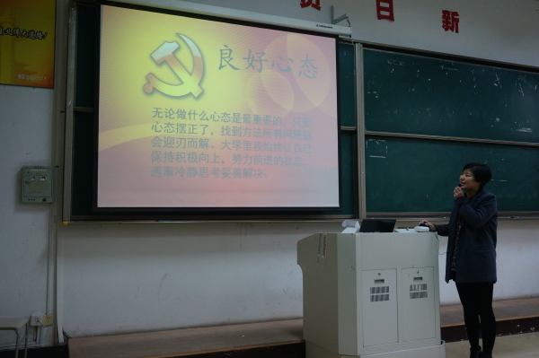 12:30分讲座正式开始,团委书记王欣用PPT的形式授课,其内容主要从“党员发展程序及有关材料的编写”和“如何发挥学生党员先锋模范作用”展开讲述。入党大致流程分为:党校结业、团内推优、入党积极分子、预备党员和正式党员。王欣表示:“想要从一名普通的团员脱颖而出成为一名真正的党员是需要经过漫长的时间,要经得住考验,是自己成为一名优秀的人。”并且她也希望在座的同学们能够更加努力,向自己的目标,向党积极靠拢,争取早日成为一名光荣的共产党员。