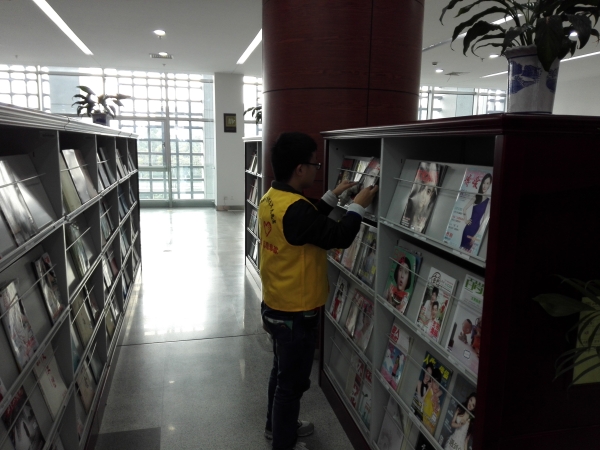 为了让广大读者有一个更好的阅读环境,为同学们提供良好的阅读氛围。2014年12月11日,在海天学院志愿者部的组织下,海天学院志愿者部干事王旭波一行人来到图书馆进行志愿者活动。