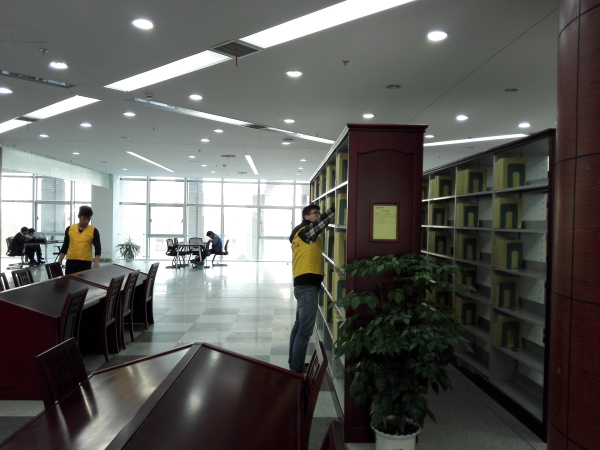 来到图书馆,在与图书馆管理员的沟通下,志愿者们明确了自己的任务,在王旭波同学的指导下分为两组,一组负责期刊区域,另一组负责整理及清洁阅览内的座椅。负责期刊的志愿者不仅仅清理了期刊区的书架,还对旧期刊进行了整理和清洁,确保读者们拿到的每本期刊都是干干净净的,让读者们享受最舒适的阅读。而负责座椅的志愿者们也是认真的擦拭着每一张座椅,水换了一遍又一遍,在这寒冷的冬日,汗水湿透了志愿者们的衣衫,但没有一位志愿者有任何的抱怨。