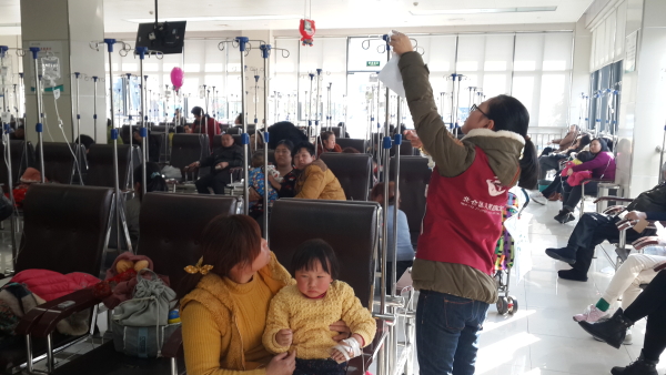该志愿者活动分为四块内容,分别为输液大厅,自助挂号,取票化验单以及为病人指路的工作。其中输液大厅的2名志愿者为病人提吊瓶,及时呼叫医院护理人员,还会与小朋友一同玩耍。自助挂号区的2名志愿者能够及时为病人挂号,让他们能够尽快得到就诊。取票化验单的2名志愿者为一些不懂得如何操作的病人取化验单,能够及时做到取票。还有指路的2名志愿者能够为不知方向的病人们指明道路。有了志愿者们的贴心帮助,病人们能够节约不少的时间,也能够让病得到尽快的就诊康复。