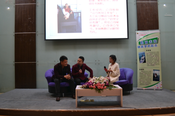 “学会微笑,对每一个见面的人微笑,别人也会回报与你。学会感恩,感谢所有帮助过自己的人”,这是肖朝阳总结出的两点。他讲到大一时的自己,害羞胆小,即使内心有想法也不会说出来。一次机会,让他明白抓住机遇,才能更接近成功。后来的他,时刻做好准备,敢于举手,敢于发言。访谈中,主持人问及那时的梦想是什么?“那时的梦想,大概就是一群人在一起,让每天的生活过的不一样,让每天的生活过的精彩。”谈到梦想,肖朝阳的眼里闪着光。和田清海不同的是,他的大学生活多姿多彩,和朋友一起到处玩到处逛,趁着年轻。而提到创业,他讲到当时的心酸,毅力很重要。不管多少次失败都要记得自己的闪光点,时刻做好准备并把它展现出来。