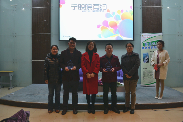 接着是观众提问的时间,面对学弟学妹热情的提问,田清海和肖朝阳将自己的工作经验心路历程一一分享给大家。现场气氛活跃,嘉宾和观众互动频繁。节目的最后,由国贸专业负责人邱老师和营销专业负责人马老师为两位嘉宾颁发学院纪念品。接着在老师和他们的合影中,主持人宣布本期宁职院有约到此结束。