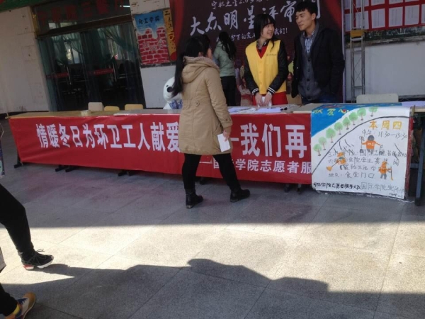 2014年12月18日星期四中午,宁波职业技术学院国际学院的志愿者们在学校食堂门口,开展了“暖冬为环卫工人献爱心”的爱心捐献活动。