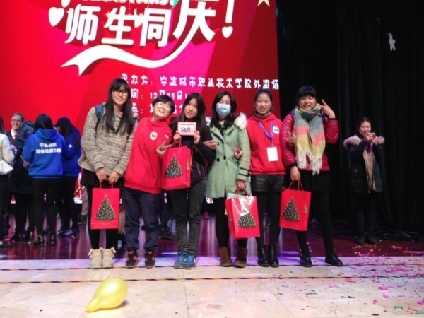 12月23日晚,国际学院团委学生会受宁波职业技术学院外国语学院团委学生会邀请参加了该分院的感恩大型圣诞晚会,参与晚会的同学她们分别是主席团助理陈露露、黄紫燕、高琳娜、生活部苏紫燕一走进综合楼的大礼堂门口,几位圣诞老人热情的送上圣诞大礼包并与我们拍照留念。这无疑将两院的友谊之情在这一刻拉的更紧了。