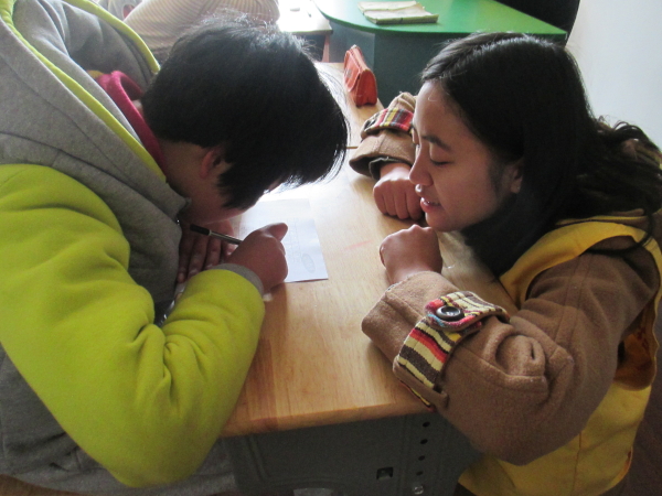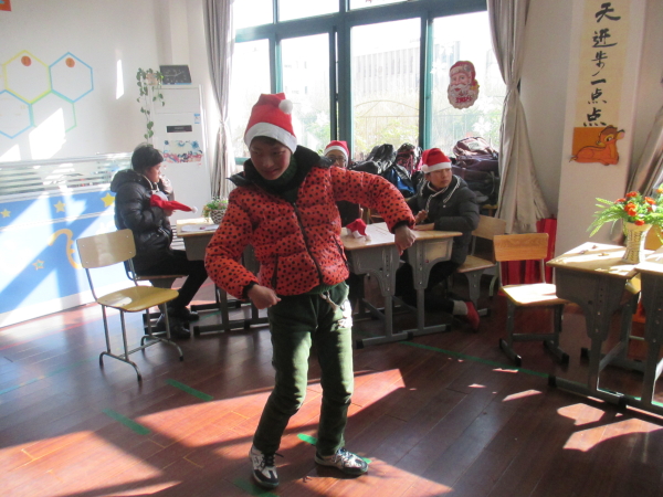 阳光学校有五个班级,每个班级分配三个志愿者。志愿者们的任务是和这群特殊的孩子一起玩游戏表演节目。所有人的头上都戴上了圣诞帽,桌子上摆满了零食与点心,有的孩子表演《小苹果》舞蹈,有的孩子主动上台表演诗歌朗诵和绕口令等,赢得了志愿者们和老师们的阵阵掌声。随后,志愿者们和孩子们玩起了萝卜蹲的游戏,很快与特殊儿童形成了默契,然而这个游戏也让整个教室都沸腾起来。孩子们都积极主动地参与游戏,有说有笑,他们还做了圣诞贺卡送给志愿者们,收到孩子们的贺卡志愿者们也十分高兴。
