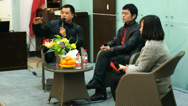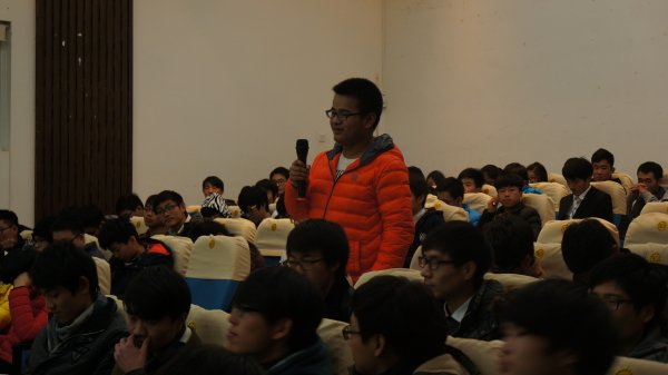 沃志平学长,原机电4041学员,在校期间任海天学院体育部部长,目前是宁波新晶不锈钢有限公司股东。沃学长为我们讲述了其大学期间参加学生会后为自己培养了团队能力和组织能力,为自己之后走上工作岗位打下了基础,同时鼓励在场的学弟学妹多参加大学期间的活动,还强调在毕业实习时要虚心向师傅求教。另一位顾学长,原机电4041学员,现是在宁波海天塑机集团有限公司上班。顾学长为同学们讲述工作时要有吃苦精神,不要轻易放弃,坚持就是胜利。毕业后自己所学的跟实际工作有差别,自己多摸索和专研,才能不落后于人。