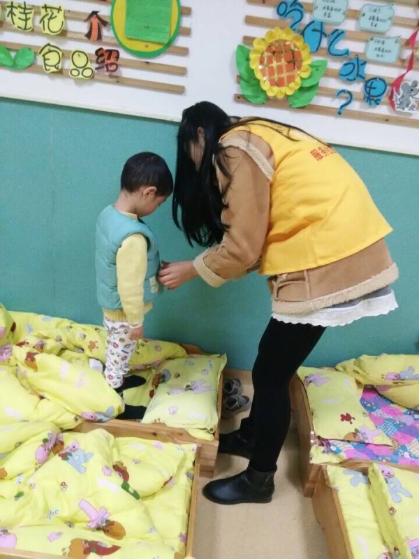 图为:志愿者帮助孩子们起床