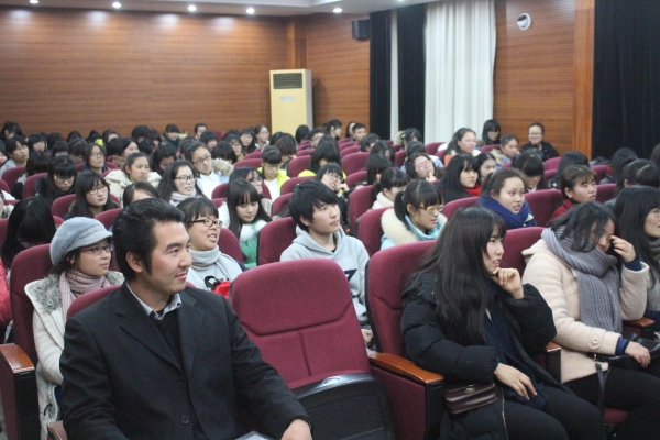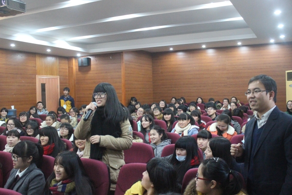 所谓的对外汉语通俗点讲就是教外国人学中文。如今,中国在世界上的崛起,使汉语越来越成为外国人学习第二语言的不二选择。截至今年九月,全年已拥有465所孔子学院,713个孔子课堂,可见汉语发展之迅速。为了使同学们对对外汉语这个职业有深入了解,朱列老师通过一系列的互动小游戏来向大家讲述。其中小游戏都是围绕着汉语展开,有绕口令、猜词语等,游戏优胜者还得到了小礼品,文房四宝。