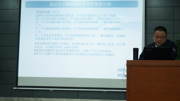 本次宣讲会,三家公司分别想同学们展示了本公司的优势和基本情况,介绍了如今模具专业所缺少人才类型,为大二学子提供毕业后的就业岗位参考,同时也希望海天模具班的学子到三家公司去实习。宁波辉旺铸模实业有限公司还有一位宁职院08届学长,相对于三位企业代表的讲诉,学长的讲诉更好的为模具班的学子提供宝贵的意见和接下去怎么做,细分了近期同学们的努力方向。最后三位模具专业的老师强调校企合作是为海天学子提供的一个平台,能为学生在学习中理论和实践相结合,更好的帮助学生学习。