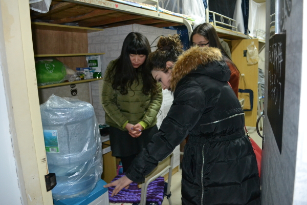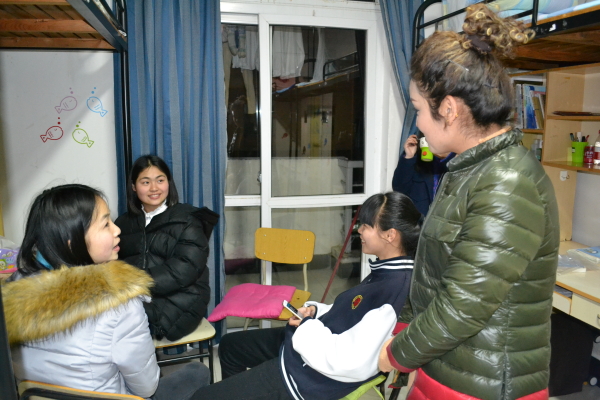 图为:米娜老师与同学们聊天互动 在米娜老师向寝室楼生活阿姨仔细询问寝室情况之后,走访活动就正式开始。在走访每个寝室的过程中,米娜老师都会与同学们亲切交谈,详细询问同学们宿舍生活情况和学习中的情况,告诉同学们若有任何困难,都可以随时来找老师或去找学姐学长们帮忙,同学们也纷纷对老师的关心表示了感谢。在遇到装饰非常好或陈设整洁的寝室时,米娜老师也会像学生们一样表扬寝室里的同学,宿舍内也不时传来阵阵欢声笑语,洋溢着和谐的气氛。在临走前,米娜老师又细心提醒同学要安全用电,老师温暖的话语一直流淌在每个人的心底,这在无形之中也拉近了师生们之间的距离。