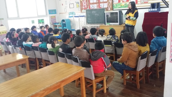 图为:志愿者为孩子们讲故事 而为孩子们讲故事的志愿者在老师的带领下来到了多媒体教室,小朋友一一坐在位置上对志愿者的到来表示非常喜悦,发出一阵阵欢乐的笑声,两位国际学院的志愿者给孩子们带去了《小猫当当的故事 》《找回微笑》两个故事,小朋友非常认真的听着故事,还积极举手发言,与志愿者进行互动,整个教室充满欢声笑语。