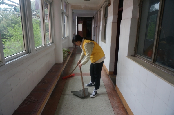 在得到福利院工作人员的安排后,志愿者们从带队队长那里领完抹布就开始投入工作中。以三名志愿者为一组负责一个楼层的清扫工作。三名志愿者各自分工,一名志愿者负责扫地,另外两名志愿者负责擦窗户和瓷砖以及楼梯的扶手。因为天气潮湿,细心的志愿者们考虑到老人走路不方便可能会摔倒,便取消了拖地的工作。