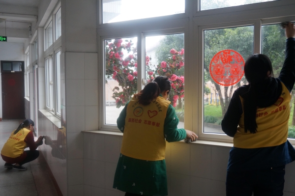 图为;志愿者们在擦拭窗户和瓷砖