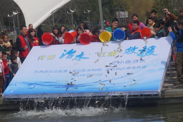 吃完午饭,志愿者们来到了北仑新区音乐喷泉附近的湖边。接着,每个志愿者都提着水桶去装着鱼苗的车上装了鱼,然后来到湖边进行放生鱼苗的活动。通过放生鱼儿,来改善水环境,这是很有意义的活动。