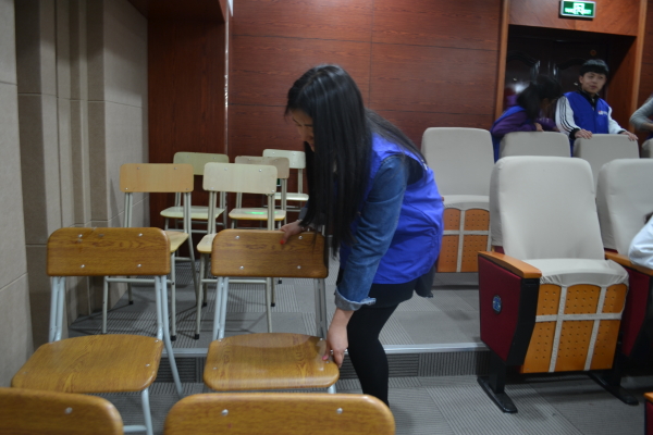 音乐会开始前,义工大队的同学们就早早来到现场,开始进行现场椅子的摆放,虽听起来也并不是繁琐的任务,但为了到场的每一位听众能欣赏到美妙的音乐,他们则要调整好椅子的角度,整齐规划地进行摆放,保证每个观众的视线都不被前排挡住。此外,他们还要检查每个座位的整洁以听众们提供一个舒适的环境欣赏演奏。