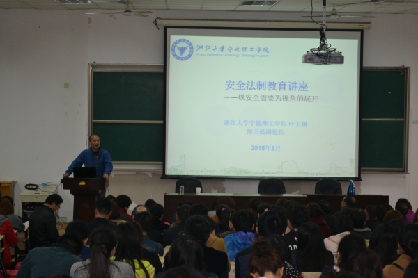 为增强学生的安全意识,提高学生的法律意识,营造文明、平安、和谐的校园育人环境。2015年3月26日下午3点,宁波职业技术学院特别邀请到浙江大学宁波理工学院保卫处副处长叶卫树老师在精技楼503教室举行以安全需要为视角展开的安全法制教育讲座,工商学院部分团委学生会委员、主席团成员以及全体大一、大二班长团支书参与本次讲座。