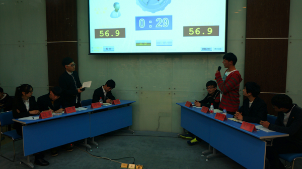 图为:双方辩手在角逐中 最后,在稍作休息之后,海天学院分场的“明德杯”大学生辩论赛决赛就拉开了帷幕。而在双方辩手毫不知情的前提下新鲜出炉的辩题也在最后的时间登场。“对于大学生是是提早上课,还是准时去上课”这个辩题,这个难题彻底为难了反方辩手,但是反方辩手沉着应对,将辩题限制在“上课前可以去其他地方预习复习”这一框架内,让正方辩手无力反驳,但自由辩论的最后一段时间内,双方陷入僵局,之后反方三辩凭借个人的机智地反问住正方,在这最后的时间内把握住机会,以微弱的优势取得了辩论赛的胜利。在此之后,评委对辩论赛选手进行点评并对优秀选手队伍进行颁奖。