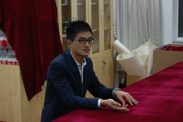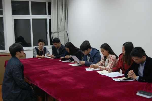 晚上6点,选拔正式开始。本次参加面试的同学分别是邱凯凯、潘弘润、叶雨航、张微亮、胡熤昊、段若男、谢跃辉、林悦慧、浮静航。面试大致分为自我介绍和提问两个环节。在自我介绍时,同学们对自己如今的学习情况和目前的工作积累做了一个简要的汇报。紧接而来的是老师、干事们的一大波“言语”攻势,主要针对竞争该职务的原因,以及在竞选成功后对未来工作方面有什么发展、设想。面对滔滔不绝的提问,每一位同学都沉着冷静,对每一个问题做出了充分仔细的回答。虽然大家的表情显得很是从容,但那双紧握的拳头和略微夹紧的眉头,都在不经意间暴露了他们内心的紧张、焦虑。会议面试的节奏很快,短暂的沉静中不时传出一阵纸张翻动的声音,老师、干事们都在静坐思考,气氛略显沉默。会议将近8点结束,每一位同学都怀着紧张、兴奋、不安的情绪走出了会议室,等待着明天那份未知的通知。