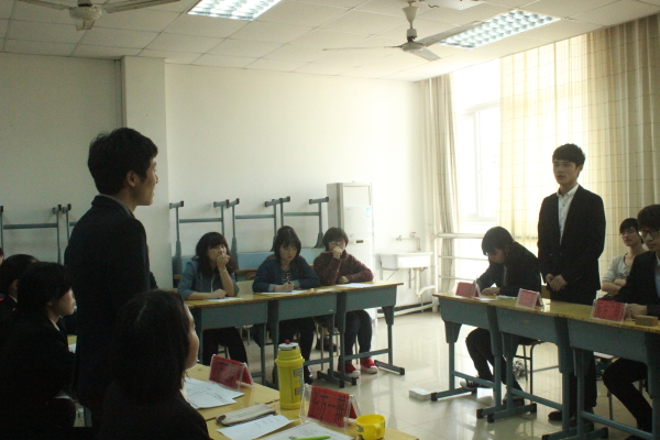 2015年3月31日,于国际学院201教室举行了 “明德杯”辩论赛总决赛。本场到场的评委分别有团副助理陈露露,办公室主任助理林霞霞,2014最佳辩手周佳颖同学和学习部的几位同学。经过前几轮激烈的赛事,两支优秀的辩论组脱颖而出,他们是来自应德3140和商英3141的辩手们.
