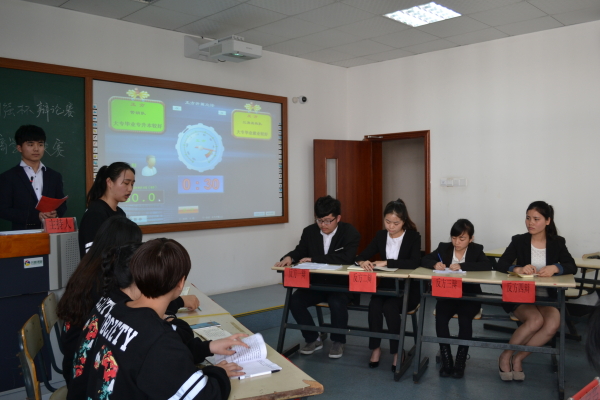 此次的辩论赛的辩题是“专升本毕业与大专就业哪个更好”,正方是营销队,反方是三角函数队。首先,主持人对正反方辩手友好问候后,辩手们都一一站起来向评委和观众们问好。其次,主持人宣布比赛规则后,比赛正式开始。首先分别由正方一辩和反方一辩发表陈词。双方观点明确,不分输赢。在第二环节时由正方三辩对反方二辩提问时把现场气氛推向高潮。犀利的提问,尖锐的视角让在座的评委老师也赞叹不已。在自由辩论环节,双方辩友都对对方观点中的漏洞一针见血,谁也不让着谁,尤其是营销队三辩的回答和措辞把三角函数队步步逼近,不免让对方感到压力。