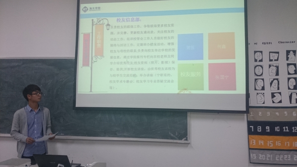 校务管理委员会作为海天学院新成立的部门,干事对于自身所应做的工作还不是很了解,本次会议便是围绕这一点所展开。会议伊始由余达辉副主任委员向全体干事宣布了校务管理委员会内部组织构架的调整,校务管理委员会下设办公室、宣信部、校友信息部和就业实践部四大部门,分别有相关干事负责,以便更好管理校务管理委员会,方便任务的安排,使组织更加的具有活力。之后还向全体干事阐述了校务管理委员会工作宗旨以及四个小部门的工作职责,安排了近期任务,并对全体干事们今后的工作提出了要求。计俊杰副主任委员之后对本次会议进行了补充,解答了干事们的一些疑惑,加强了上一级和下一级的交流。